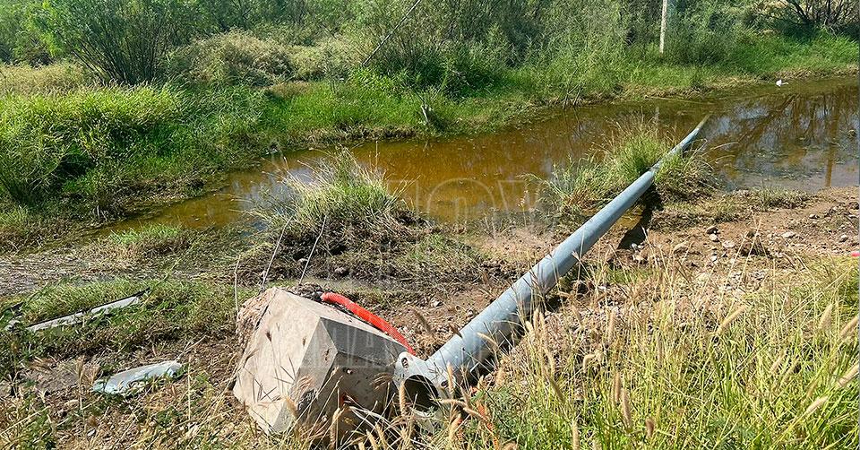 Sin poder enderezar el rumbo, el conductor se desvió a la derecha y se salió del camino, para luego estrellarse violentamente contra un enorme poste metálico que derribó.