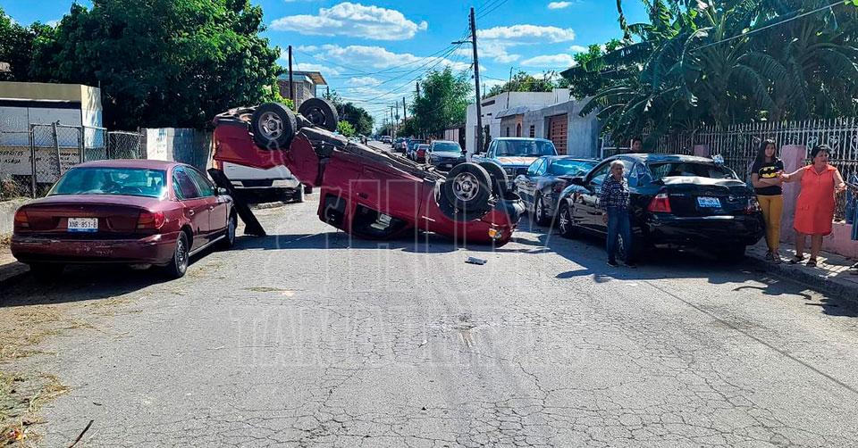 Al ir cruzando fue impactado por la Mazda Tribute de la mujer, y del encontronazo, la camioneta se volcó, no sin antes chocar contra un automóvil Ford Focus que estaba estacionado.