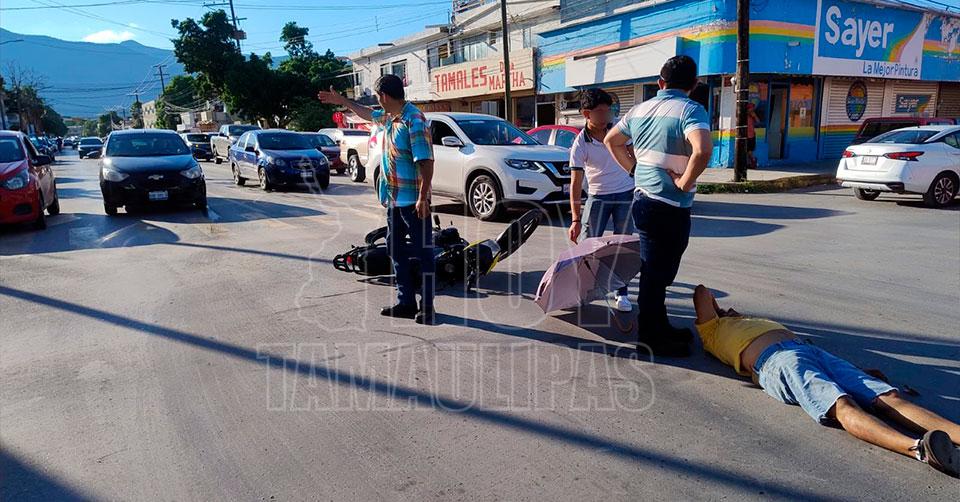 Ciudad Victoria, Tamaulipas. – Un motociclista terminó con probable fractura en extremidades inferiores esta tarde, tras chocar con un automóvil que presuntamente se le cruzó en su camino tras omitir la luz roja de un semáforo.