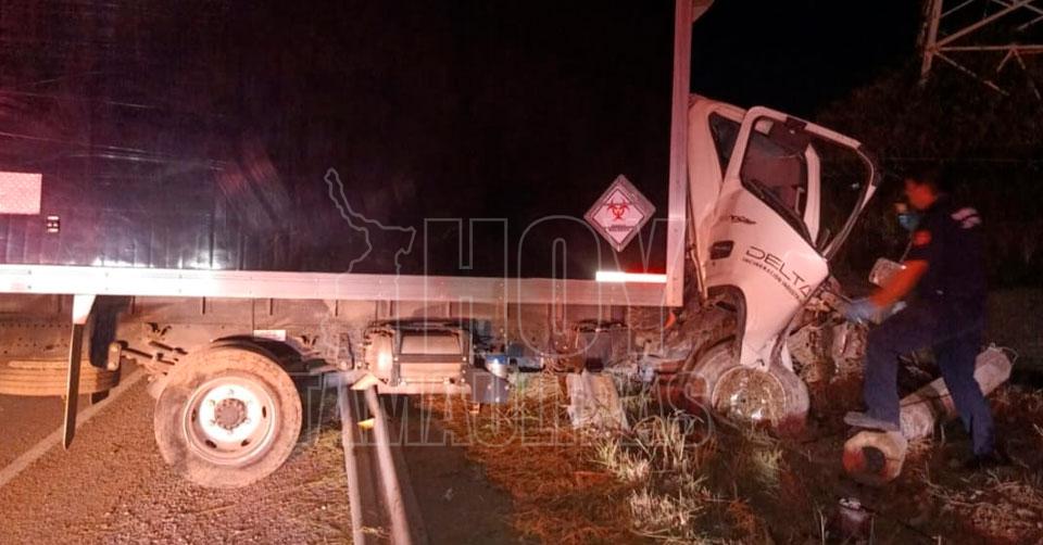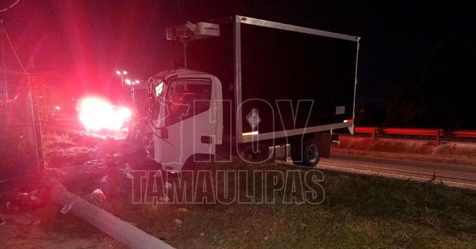 Altamira, Tamaulipas. – Un fuerte accidente vial protagonizó el conductor de un camioncito con caja frigorífica en Altamira, al perder el control y salirse del camino, estrellándose con una contención metálica y un poste de concreto propiedad de una empresa de televisión por cable el cual derribó.