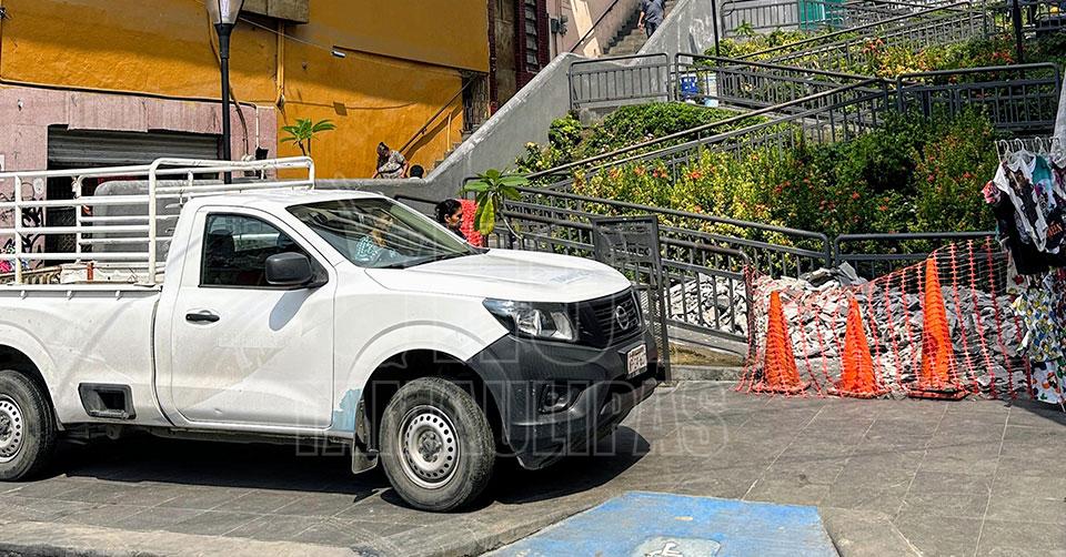Tampico, Tamaulipas. - El Ayuntamiento de Tampico a través de personal de la Secretaría de Obras Públicas, Desarrollo Urbano y Ecología municipal, dio inicio a los trabajos de transformación del piso de la bajada peatonal Fray Andrés de Olmos que conecta con el Mercado Municipal, tras evaluar que el tramo ha resultado de gran riesgo para quienes la utilizan, informó el secretario de Obras Públicas, Rogelio Ontiveros Arredondo.