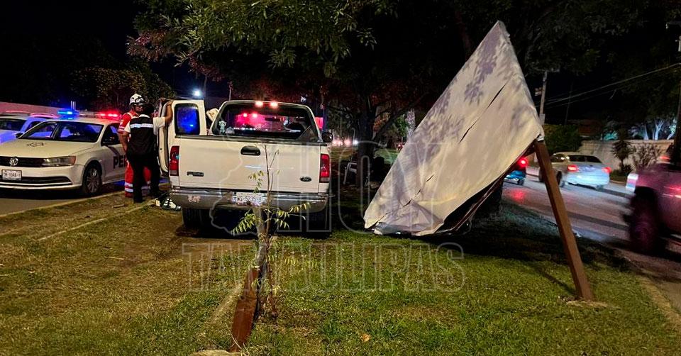 Presuntamente dormitó al volante por el cansancio de la jornada de trabajo y tras perder el control de su Ford F-F150 blanca se proyectó contra un señalamiento metálico y quedó trepado en el camellón central.
