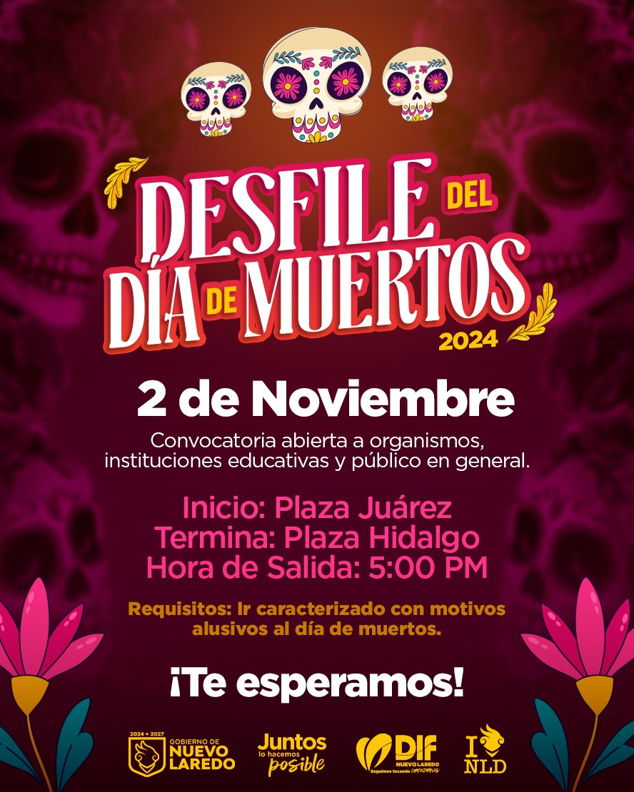 Nuevo Laredo, Tamaulipas.-Con la finalidad de mantener vivas tradiciones y costumbres mexicanas, se invita a organismos, instituciones educativas y público en general a participar este 2 de noviembre en el primer Desfile del Día de los Muertos.