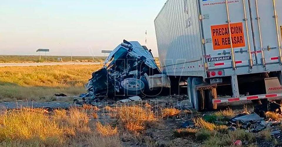 Nuevo Laredo, Tamaulipas.— Un fuerte choque entre camiones de carga sacudió la madrugada de este sábado la autopista Monterrey-Nuevo Laredo, dejando un saldo de un herido y un vehículo envuelto en llamas.