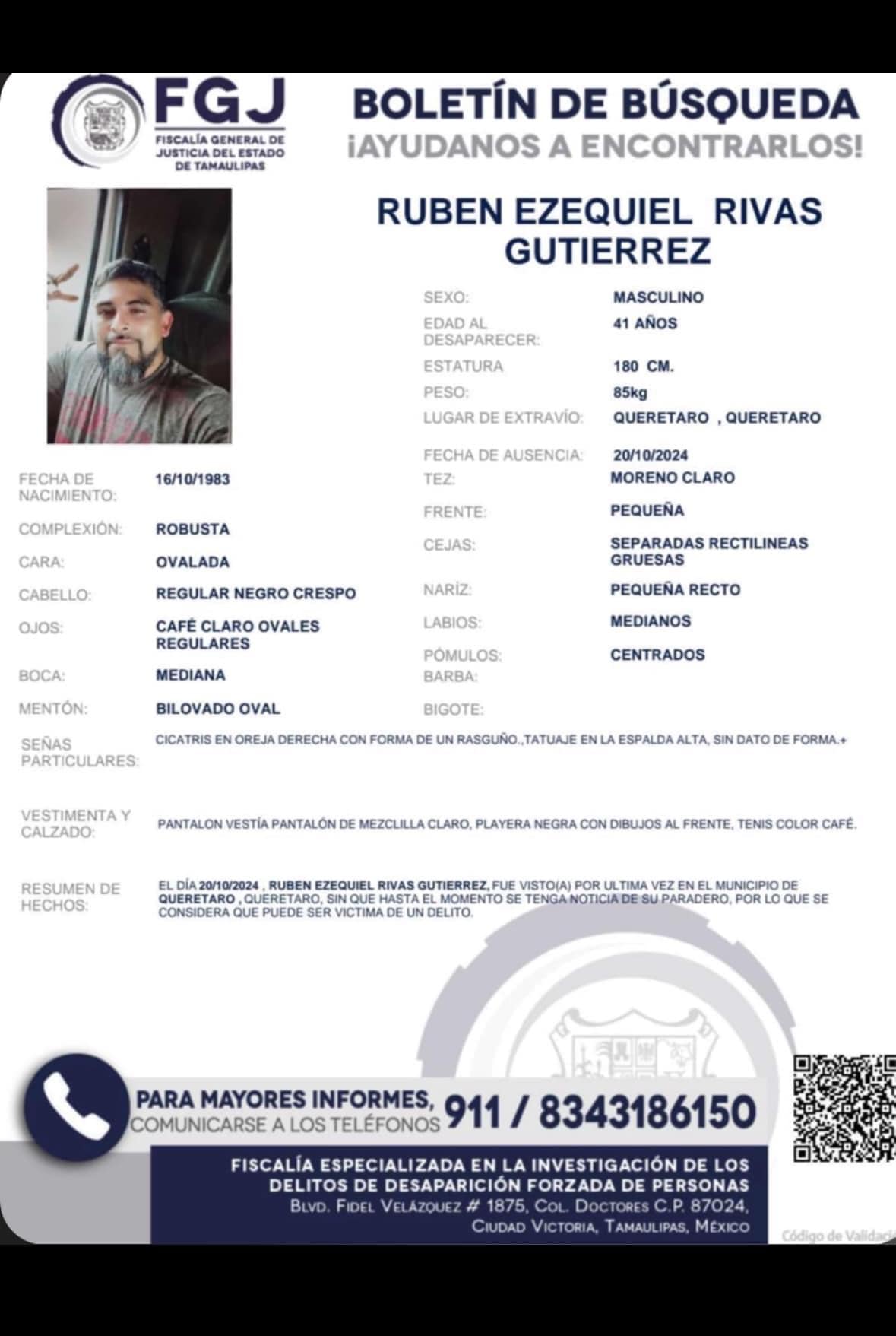 Reynosa, Tamaulipas.- Un hombre de 41 años de edad, identificado como Rubén Ezequiel Rivas Gutiérrez, fue reportado como desaparecido tras ser visto por última vez el sábado 20 de octubre en Querétaro. Sus familiares están alarmados y temen que haya sido víctima de un delito.
