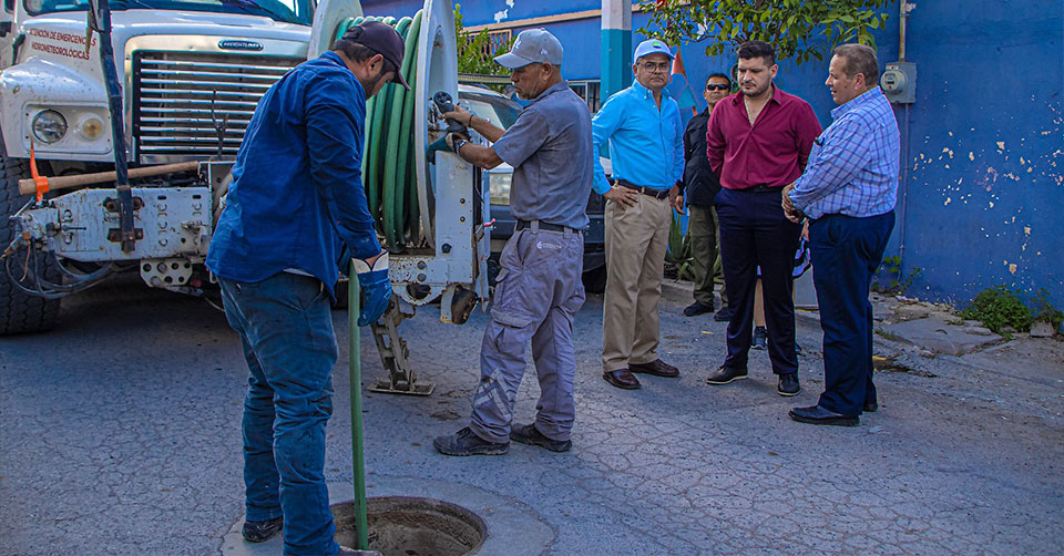 Durante el recorrido, el alcalde constató el uso de camiones vactor, equipo especializado para la limpieza y mantenimiento del sistema de drenaje, con el objetivo de prevenir inundaciones y mejorar el flujo en las redes de agua y drenaje de la ciudad.