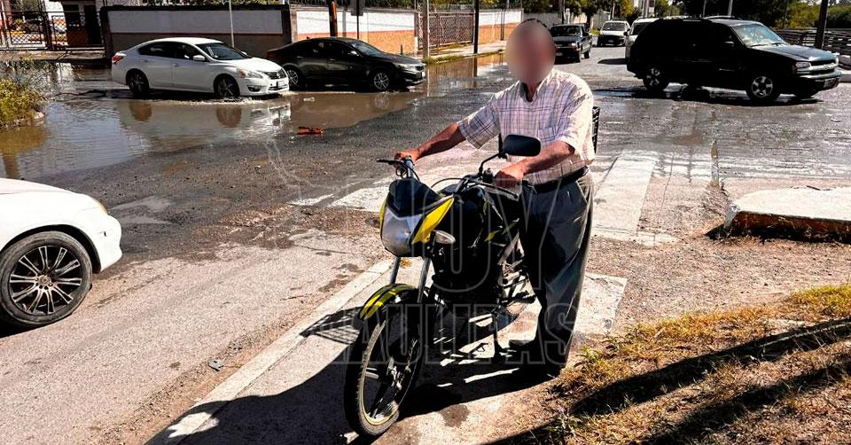 Al llegar al cruce, la motocicleta cayó en un bache cubierto por agua residuales de una fuga de alcantarilla.