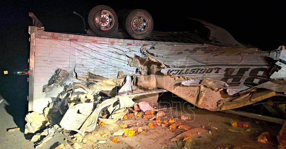 Nuevo Laredo, Tamaulipas. — Una trágica volcadura en la autopista a Monterrey, cerca de Nuevo Laredo, cobró la vida de un operador de tráiler, quien presuntamente se durmió al volante.