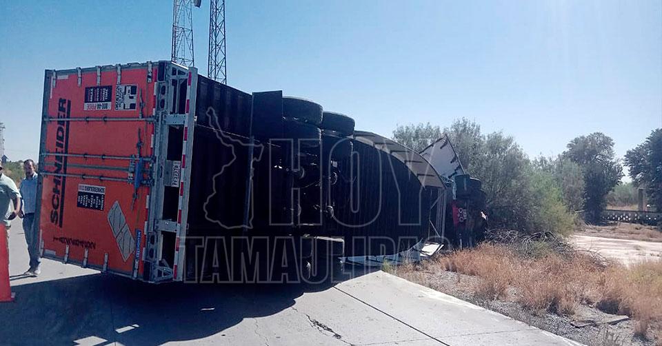 Nuevo Laredo, Tamaulipas. — Un chofer de tráiler se salvó de milagro tras protagonizar una aparatosa volcadura en el Libramiento Mex 2, al sur de Nuevo Laredo, por causas que aún se desconocen.