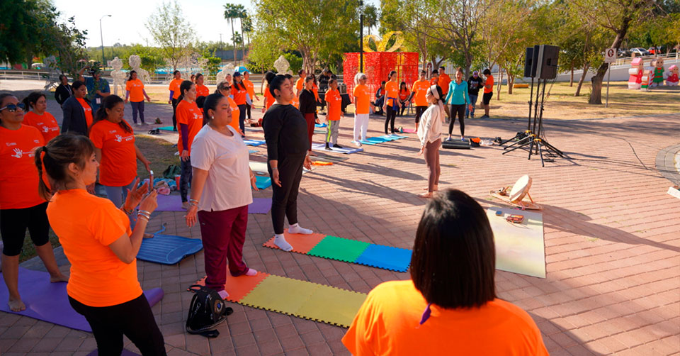 Nuevo Laredo, Tamaulipas. - En el marco del Día Internacional para la Eliminación de la Violencia contra la Mujer, se llevó a cabo el evento “Mi primer encuentro con la Yoga, Mujer…respira” en el Parque Viveros, donde más de 30 mujeres se reunieron con el propósito de encontrar paz interior a través de la meditación y el ejercicio físico.