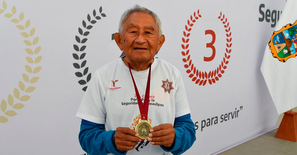 Ciudad Victoria, Tamaulipas. - Roberto Jiménez Sánchez, participante de la Segunda Carrera “por la Paz y la Seguridad en Tamaulipas” recibió un reconocimiento y premio por su perseverancia de parte de la Secretaría de Seguridad Pública de Tamaulipas (SSPT), puesto que, a sus 86 años se desempeña como atleta, demostrando que no existen límites para dedicarse a esta disciplina.