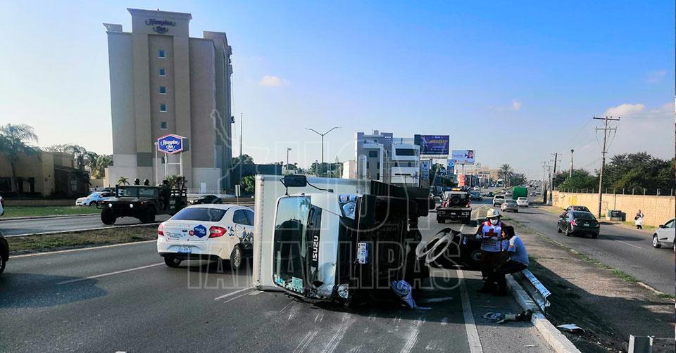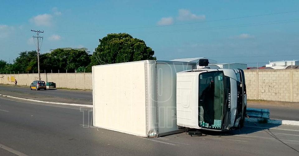 El accidente ocurrió la tarde de este lunes, cuando el vehículo de carga Isuzu color blanco aparentemente circulaba hacia Altamira con evidente exceso de velocidad.