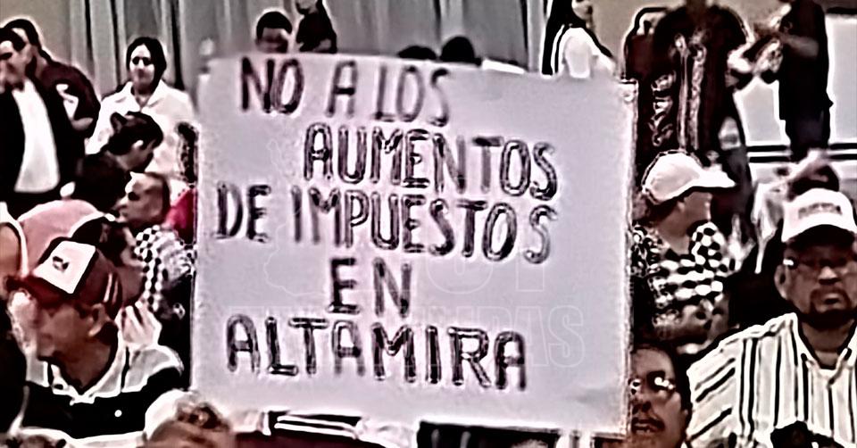 Los quejosos le mostraron al alcalde cuando pasaba frente a ellos dos pancartas, en las que se podían leer: "No a los aumentos de impuestos en Altamira", y "No a la privatización de carreteras en Tamaulipas", y enojando al jefe de la Comuna altamirense, avanzó más rápido hacia la parte de enfrente donde le tenían reservada una silla.