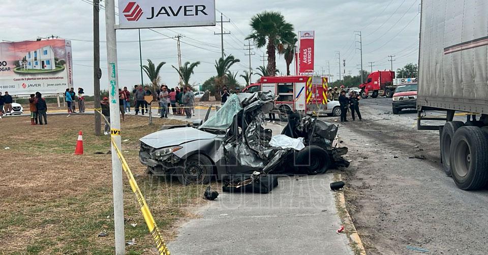 Reynosa, Tamaulipas. - Dos hombres murieron y una mujer resultó grave al estrellarse el auto de plataforma Didi en el que viajaban esta tarde con unidades de carga pesada en la carretera Reynosa-San Fernando, a la entrada al Fraccionamiento Pirámides.