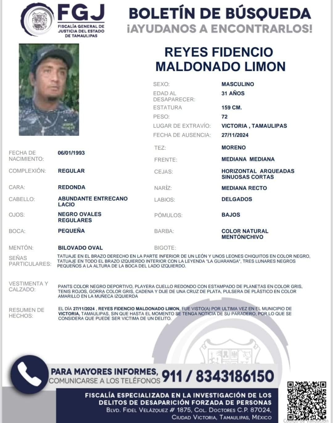 Ciudad Victoria, Tamaulipas.- El 27 de noviembre, Reyes Fidencio Maldonado de 31 años fue visto por última vez en Ciudad Victoria, Tamaulipas y hasta el momento no se sabe nada de su paradero.