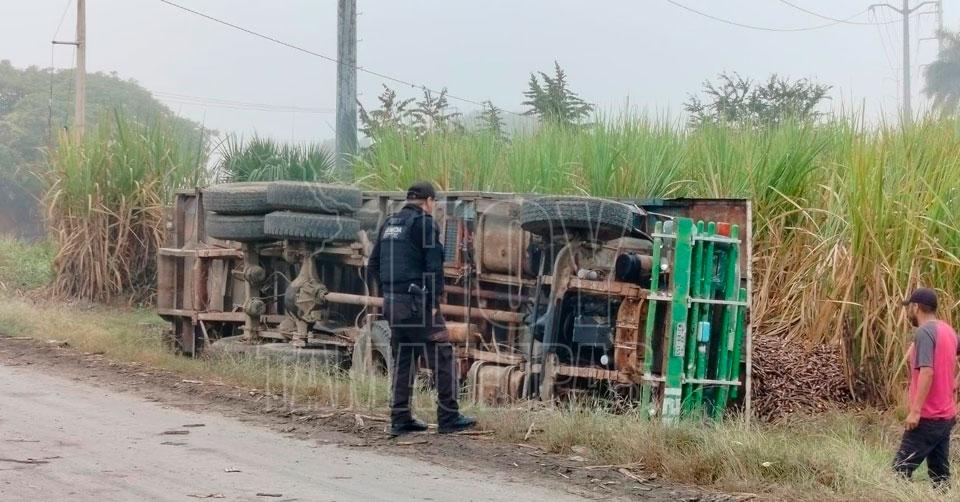 La carga quedó esparcida entre un sembradío de caña y el camión sufrió cuantiosos daños materiales.