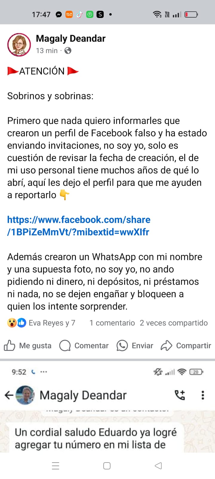 "Además crearon un WhatsApp con mi nombre y una supuesta foto, no soy yo, no ando pidiendo ni dinero, ni depósitos, ni préstamos ni nada, no se dejen engañar y bloqueen a quien los intente sorprender".