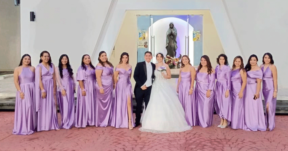 Siguió el momento de dirigirse al salón de fiestas, donde ya los esperaban más invitados; ahí los novios hicieron la entrada triunfal precedidos por las damas enfundadas en elegantes vestidos color lila, que fueron las primeras en bajar las escaleras que conducían al centro de la pista para hacer un círculo y recibir a Reyna y Javier, quienes inmediatamente arrancaron con el baile, ante el aplauso y alegría de los invitados.
