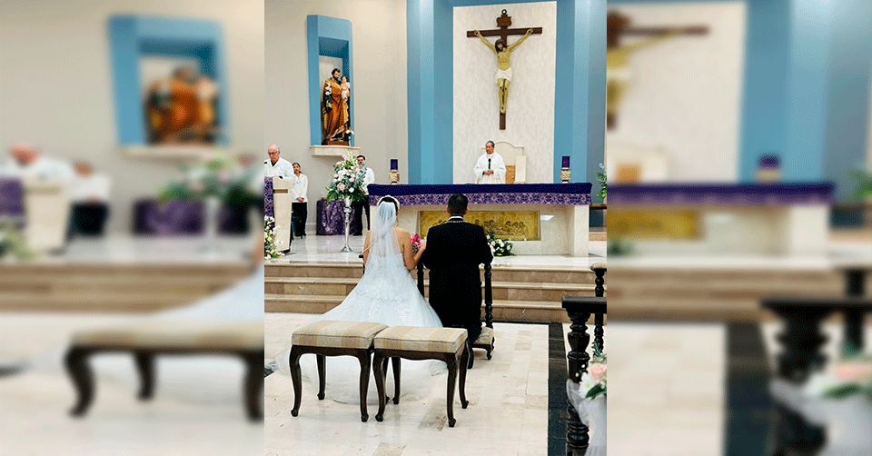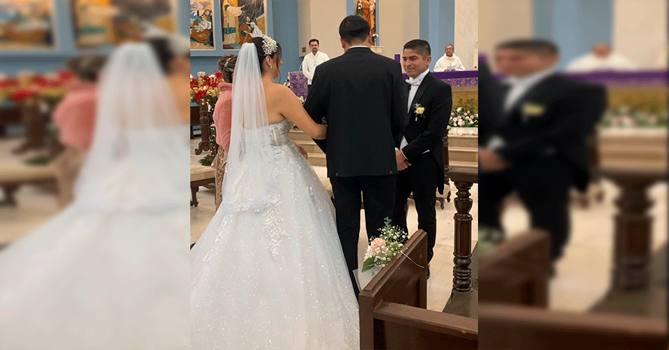 La Parroquia San José esposo de la Virgen María en Apodaca recibió el cortejo nupcial encabezado por Javier acompañado de su hermana Arianna Pérez y su papá Ignacio Javier Pérez quien portaba en su mano la fotografía de su esposa, que desde el cielo mandaba su bendición.