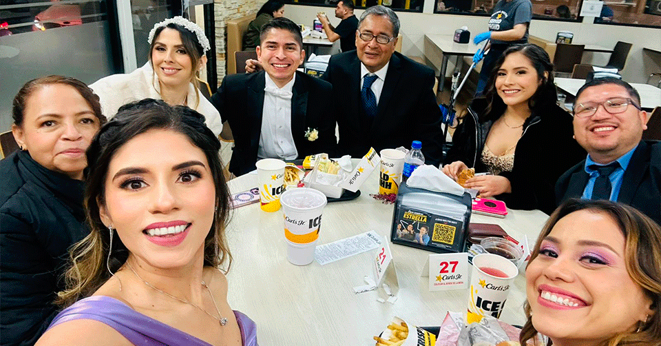 Antes de seguir al festejo, Reyna y Javier hicieron una parada en Carl´s Jr para degustar una hamburguesa, pues las prisas durante el día por las diversas actividades, no les permitió alimentarse correctamente y aún faltaban unas horas para la cena, ahí en la sucursal del Aeropuerto, los comensales quedaron sorprendidos al ver aparecer a la radiante novia con su vestido blanco, una de ellas le pidió tomarse fotografía, mientras unas niñas le decían lo hermosa que se veía.