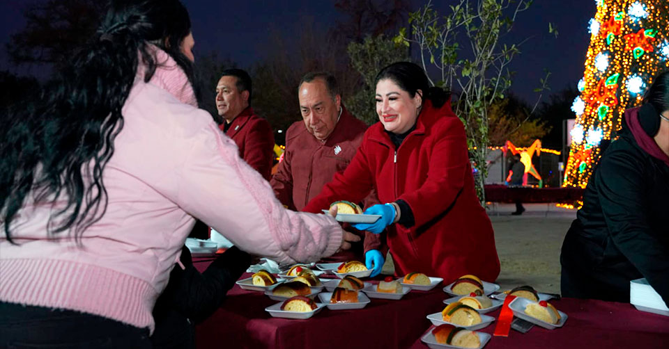Nuevo Laredo, Tamaulipas - En total fueron 100 roscas las que se partieron y fueron distribuidas entre los cientos de asistentes, entre adultos y niños, se entregó café y chocolate caliente a los asistentesCon el objetivo principal de continuar fomentando las tradiciones y reforzar el tejido social, decenas de familias neolaredenses se dieron cita en el Parque Viveros Mágico para partir la mega Rosca de Reyes con lo que se marca la finalización de la temporada navideña.