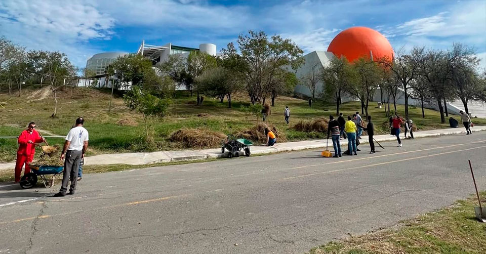 Ciudad Victoria, Tamaulipas. - Personal del Museo de Historia Natural (TAMUX), el Planetario “Dr. Ramiro Iglesias Leal” y la Unidad Deportiva Siglo XXI, realizaron labores de limpieza en jardines, banquetas y cordones.
