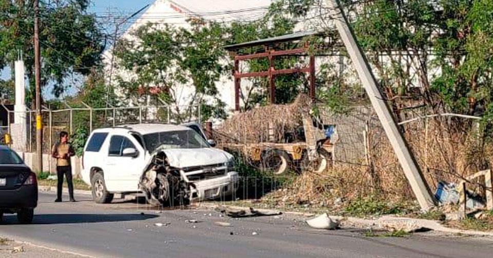 Ciudad Victoria, Tamaulipas.- Un accidente vial ocurrido en el Eje Vial Lázaro Cárdenas, cerca de la calle Michoacán, dejó sin suministro eléctrico a varios sectores del fraccionamiento aledaño, luego de que una camioneta Chevrolet Tahoe perdiera el control y se estrellara contra un poste de la Comisión Federal de Electricidad (CFE). El impacto derribó un transformador, afectando a los residentes de la zona.