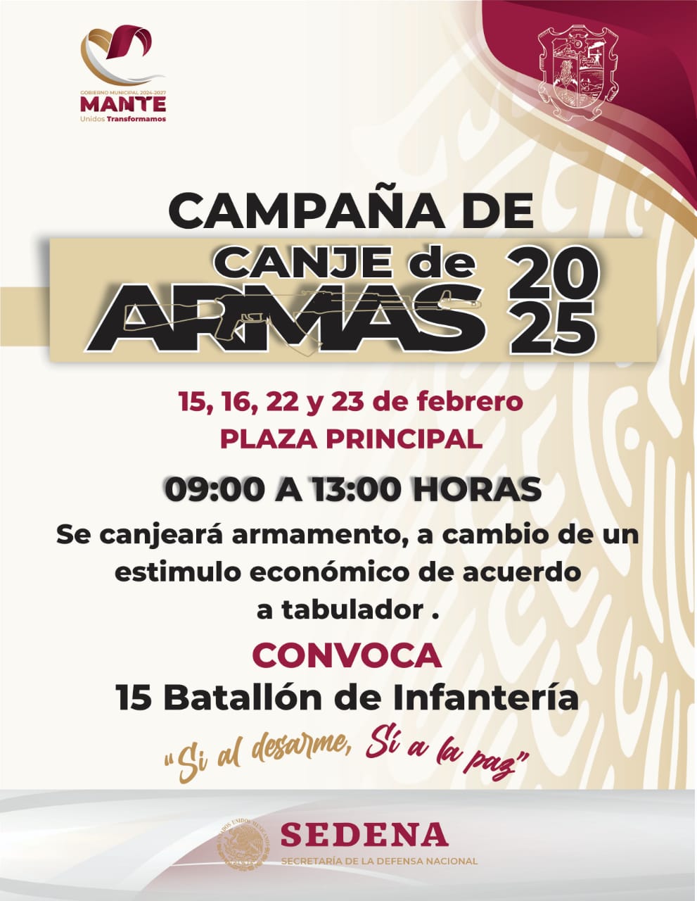 El Mante, Tamaulipas. - En una labor interinstitucional con el 15 avo batallón de Infantería, el Gobierno Municipal de El Mante, convoca a la sociedad a participar en la campaña de canje de armas por incentivo económico.