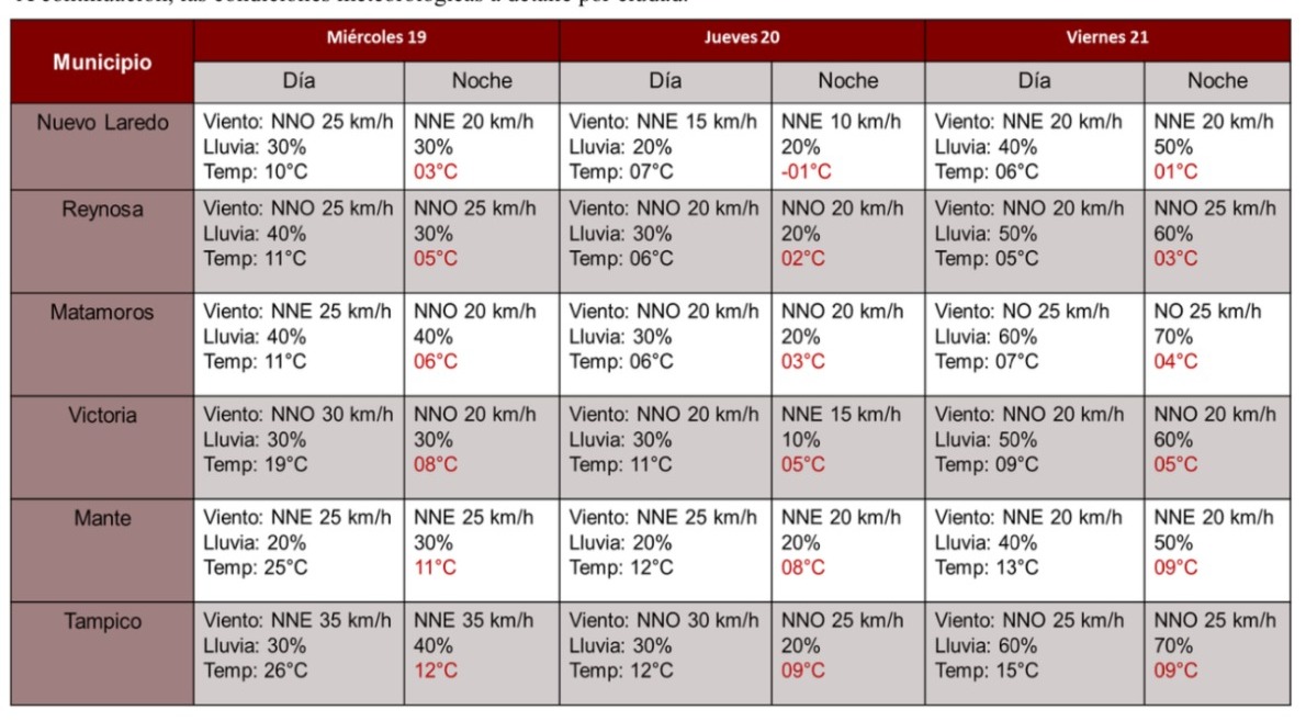 Para Nuevo Laredo, Reynosa, Matamoros y San Fernando se espera actividad de llovizna y lluvias ligeras dispersas de viernes a sábado, además se prevé una temperatura mínima de -1°C con riesgo de heladas durante la madrugada y parte de la mañana del jueves.