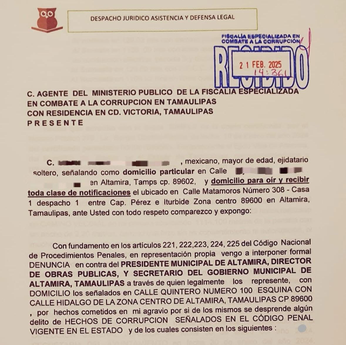 Altamira, Tamaulipas. – La abogada Gabriela Ibarra Lozano, presentó una denuncia ante la Fiscalía Especializada en Combate a la Corrupción en contra del alcalde de Altamira, el secretario del Ayuntamiento y el director de Obras Públicas, por presuntos delitos relacionados con el despojo de un bien inmueble perteneciente a su cliente, un ejidatario afectado por la construcción de un camino ejidal en diciembre de 2023.