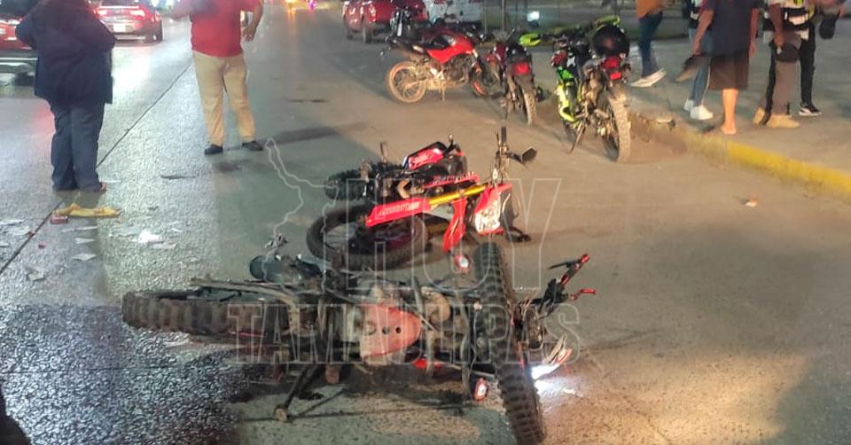 Jóvenes motociclistas chocan y rebotan contra dos camionetas en Ciudad Madero