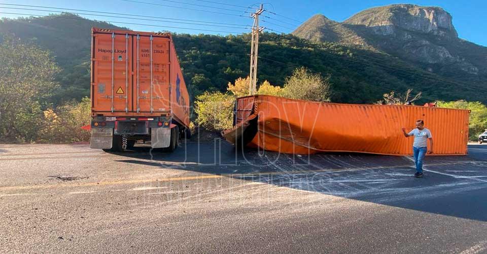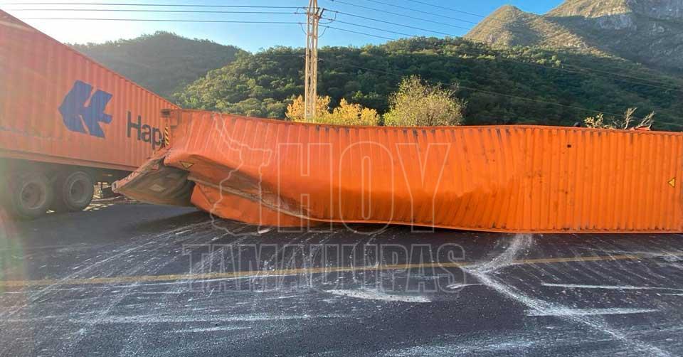 Como consecuencia del percance, la circulación vehicular se vio afectada en un carril mientras se realizaban las maniobras para remover el contenedor volcado y el primer remolque junto al tractor.