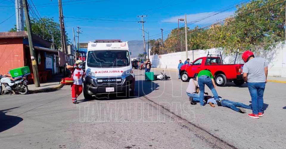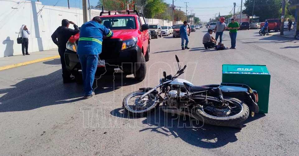 Ciudad Victoria, Tamaulipas. – Un motociclista repartidor de una refaccionaria sufrió lesiones esta mañana luego de chocar contra una camioneta Pick-Up en la intersección de la Avenida 16 de Septiembre y calle Alfonso Reyes Nte., a la altura de la Unidad General de Investigación Especializada en Justicia para Adolescentes en Ciudad Victoria.