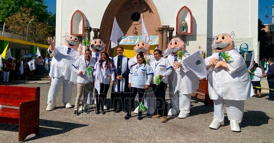 A la llegada del vehículo con las reliquias al templo que lleva su nombre, personas en las botargas del doctor simi y una vaya de fieles portando banderas con los colores verde, amarillo y blanco lo escoltaron en el estacionamiento, para luego ser recibidas por el obispo y el párroco en la puerta, para observar que bajaban a la imagen de San Judas Tadeo de tamaño real que acompaña la cápsula que contiene los fragmentos de uno de sus brazos.