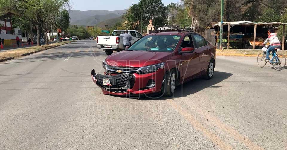 Ciudad Victoria, Tamaulipas. - Una conductora protagonizó un percance vial esta mañana cuando al salir de la colonia Américo Villarreal e incorporarse a la Calzada Tamatán, le cerró el paso a una camioneta que terminó impactando.