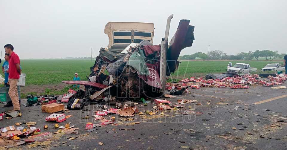 San Fernando, Tamaulipas. - Un choque por alcance entre dos tráileres cargados con toneladas de productos agrícolas ocurrió esta mañana sobre la carretera federal Victoria-Matamoros, entre San Fernando y Valle Hermoso.