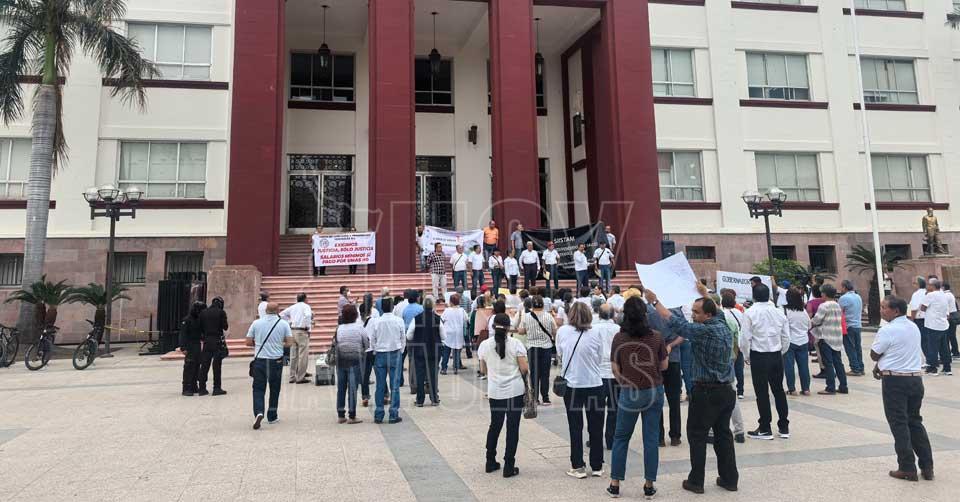 Los manifestantes, tanto federales como estatales, permanecieron en las escalinatas del Palacio de Gobierno para expresar su inconformidad y reiterar su lucha de años por cambiar el sistema de pago de UMAs a salarios mínimos.