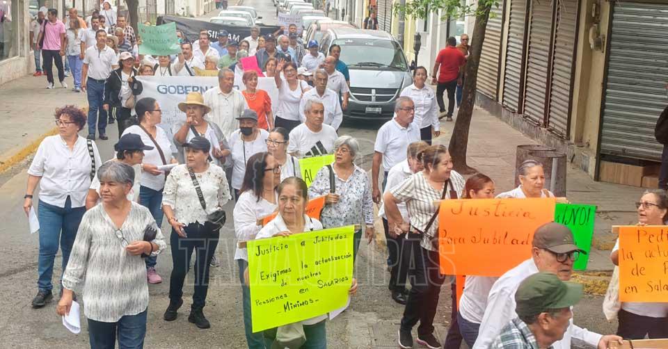 Ciudad Victoria, Tamaulipas. - Alrededor de un centenar de jubilados y pensionados marcharon desde la plaza del 8 Hidalgo hasta la explanada del Palacio de Gobierno, en la Plaza del 15 Hidalgo en Ciudad Victoria, para exigir una pensión justa y digna.