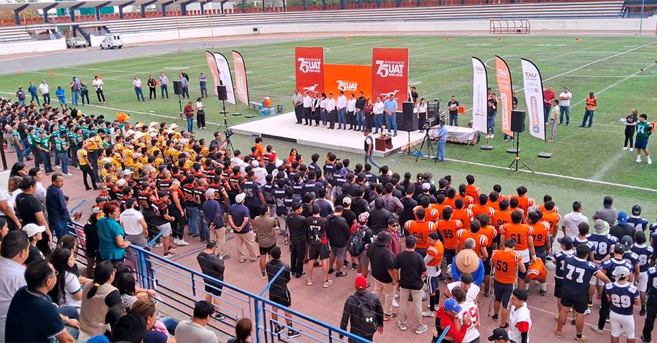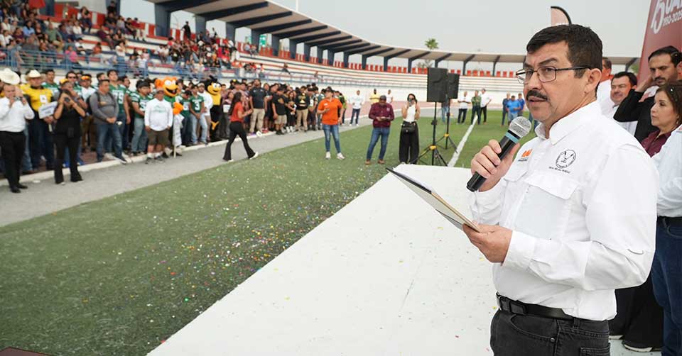 Ciudad Victoria, Tamaulipas. - El rector de la Universidad Autónoma de Tamaulipas, Dámaso Anaya Alvarado, inauguró la tarde de este jueves el torneo número 44 de la Liga Universitaria de Futbol Americano de la UAT (LUFAUAT) categoría intermedia y juvenil AA.