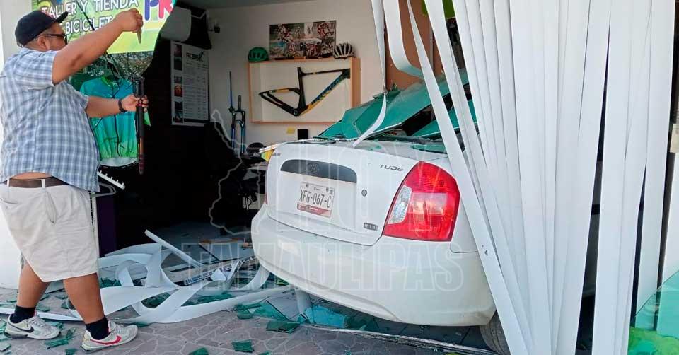 Ciudad Victoria, Tamaulipas. - Un inesperado accidente sacudió a los transeúntes y sorprendió a los empleados de una tienda de bicicletas en Ciudad Victoria, cuando un automovilista se estampó contra el local.