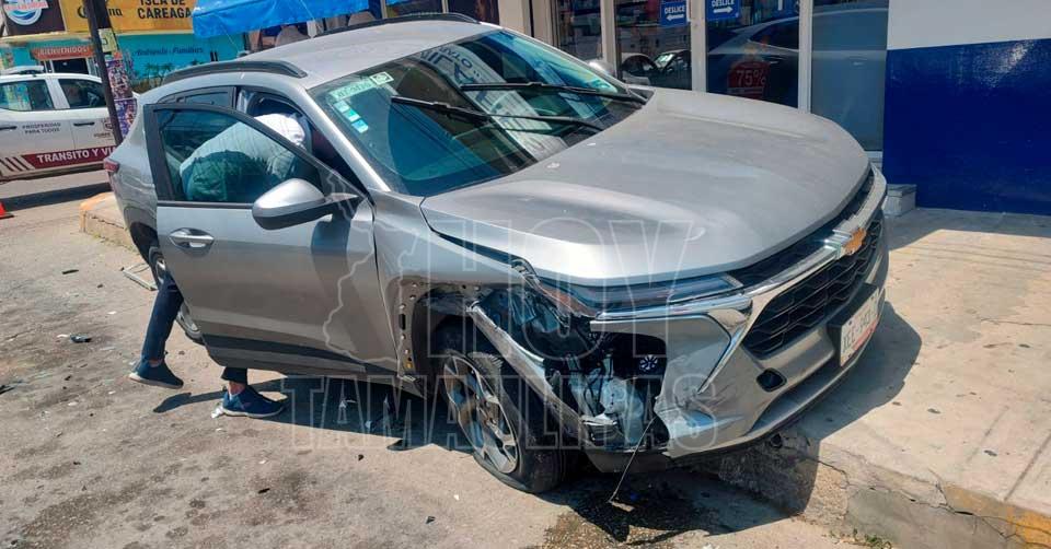 En el sitio un automóvil de la ruta Águila-Madero impactó en el costado derecho a una camioneta Chevrolet color gris plata tipo SUV, misma que por el golpe terminó sobre la banqueta frente a una Farmacia Similares.