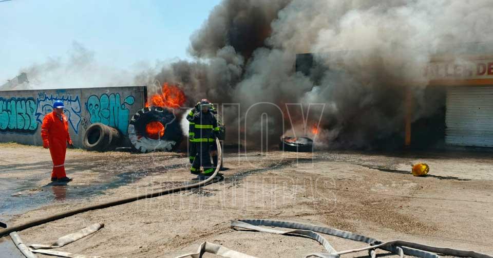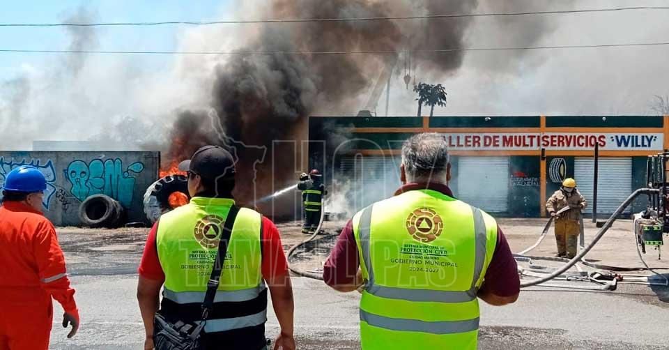 Ciudad Madero, Tamaulipas. - El impresionante incendio de llantas que se encontraban apiladas a un costado de una vulcanizadora y taller de multiservicios en Madero, movilizó este mediodía a personal de Bomberos y Protección Civil del municipio.