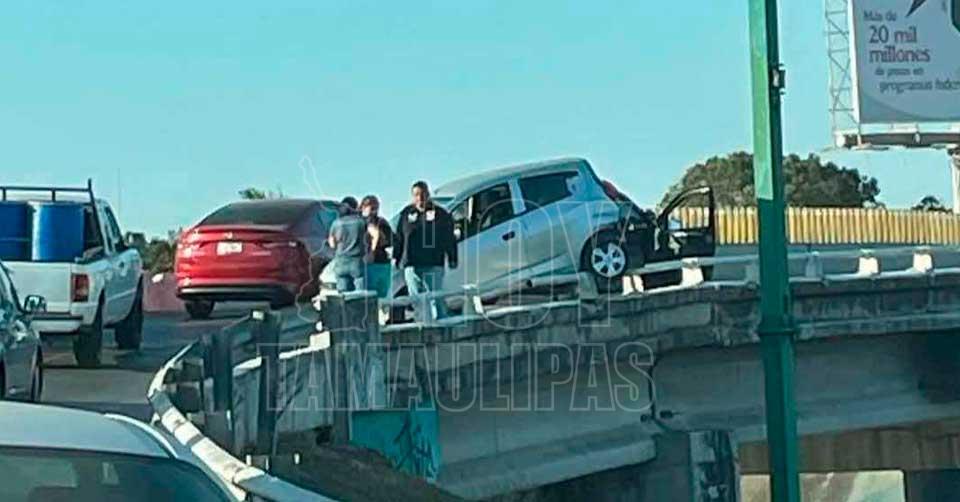 Tampico, Tamaulipas. - El susto de su vida se llevó una mujer al perder el control del volante de su mini-auto cuando, según su dicho, se le atravesó un vehículo y colisionó contra el barandal de protección del puente en el paso a desnivel Aeropuerto de Tampico.