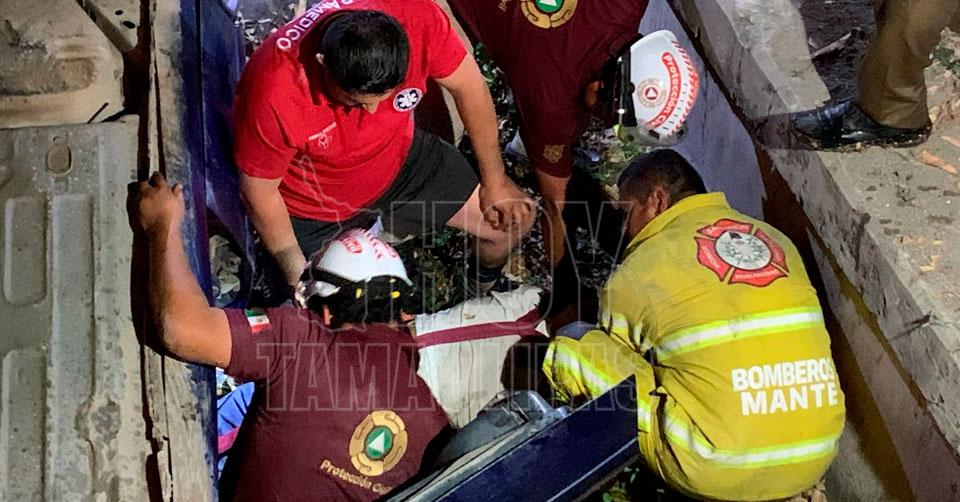 El Mante Tamaulipas. - Un hombre de aproximadamente 50 años de edad fue rescatado del interior de su vehículo, luego de que quedara atrapado al volcar en un drenaje de agua en la colonia Nicolas Moreno en el municipio de El Mante.