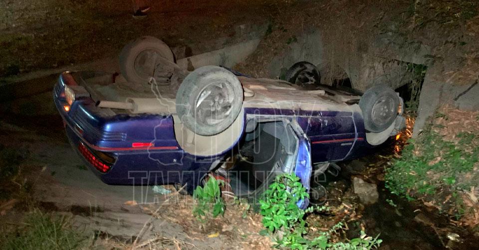 Conductor atrapado en su vehículo al volcar en desagüe en El Mante