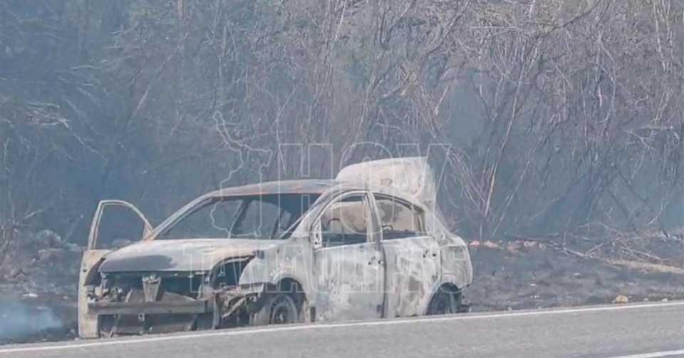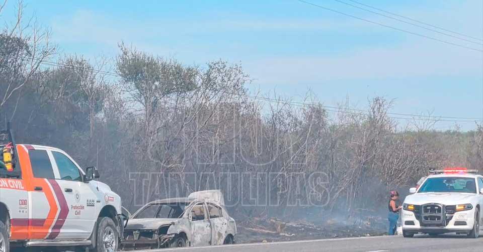 Ciudad Victoria, Tamaulipas. - Un cortocircuito en un vehículo particular provocó un incendio que generó una intensa movilización de la Guardia Estatal, la Guardia Nacional y elementos de Protección Civil, luego de que las llamas consumieran por completo la unidad y se extendieran hacia los pastizales aledaños.