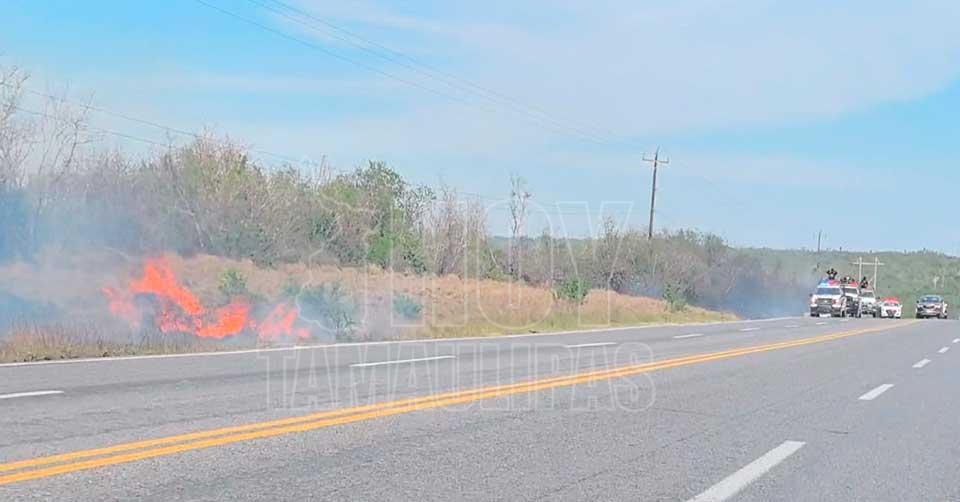 Incendio de vehículo provoca movilización y quema de pastizal en la carretera Reynosa-Victoria