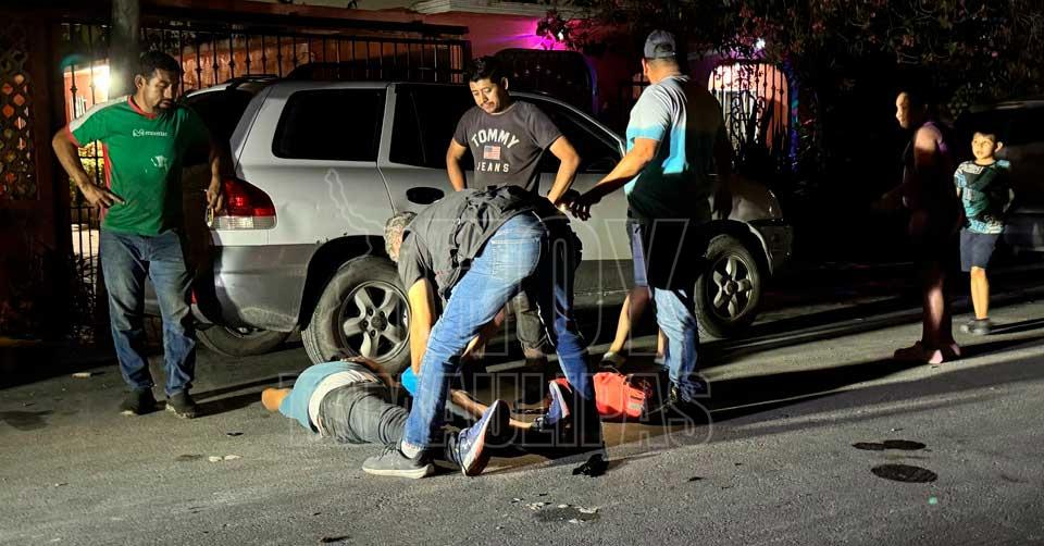 Matamoros, Tamaulipas. - Un inusual accidente ocurrió la noche de este lunes en la calle Circón de la colonia La Joya en Matamoros, luego de que una perrita se atravesara en el camino de un motociclista, provocando que éste perdiera el control y derrapara.