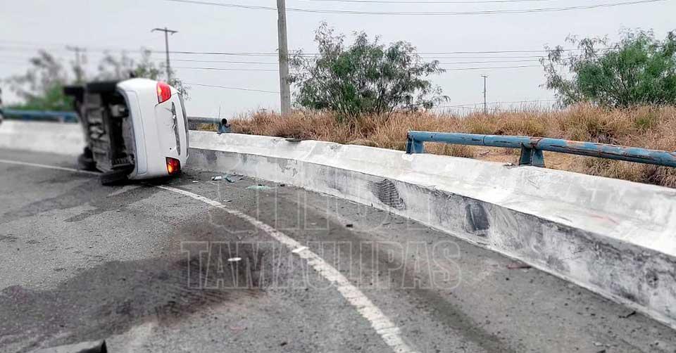 Nuevo Laredo, Tamaulipas.— Un vehículo fue abandonado por quien lo conducía después de que volcara en la rampa que conecta a la Carretera Nacional con la Carretera Antigua, al sur de Nuevo Laredo, tras chocar contra un muro de concreto.