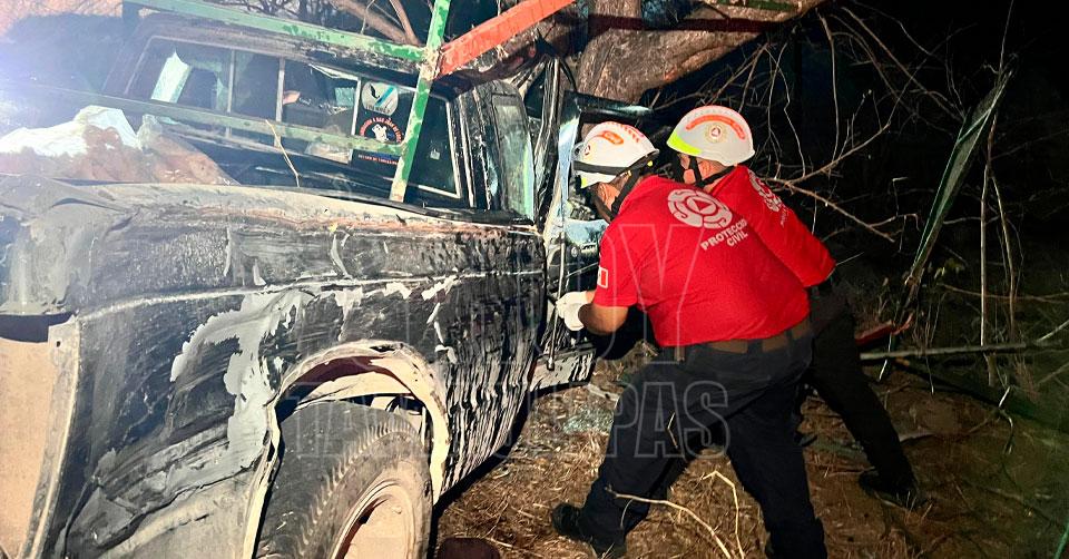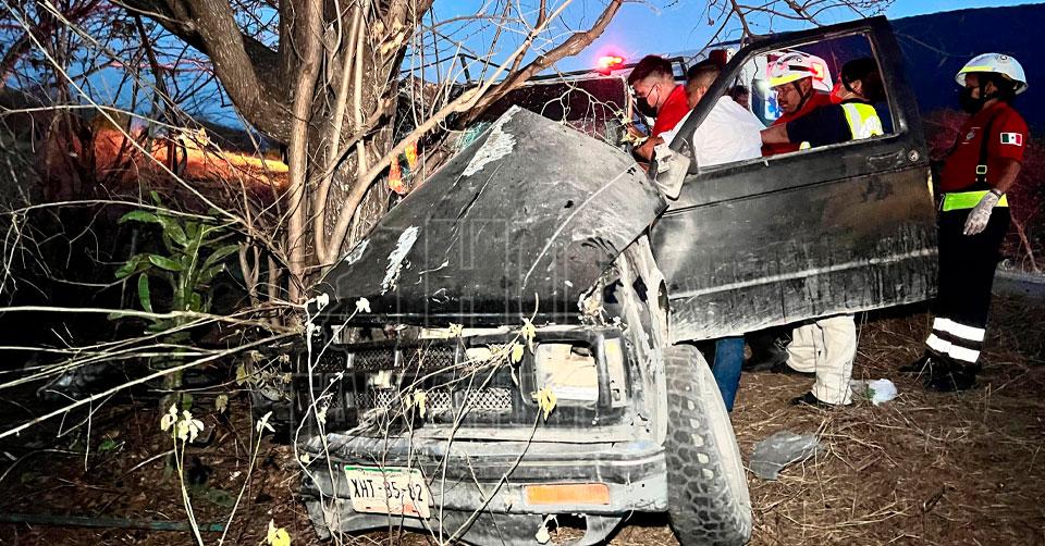 El Mante Tamaulipas. - Dos hombres estuvieron a punto de morir prensados la noche de este domingo, luego de que la camioneta en la que iban terminó por salir de la carretera y chocar contra un árbol adelante del Ejido Ojo de Agua en El Mante.